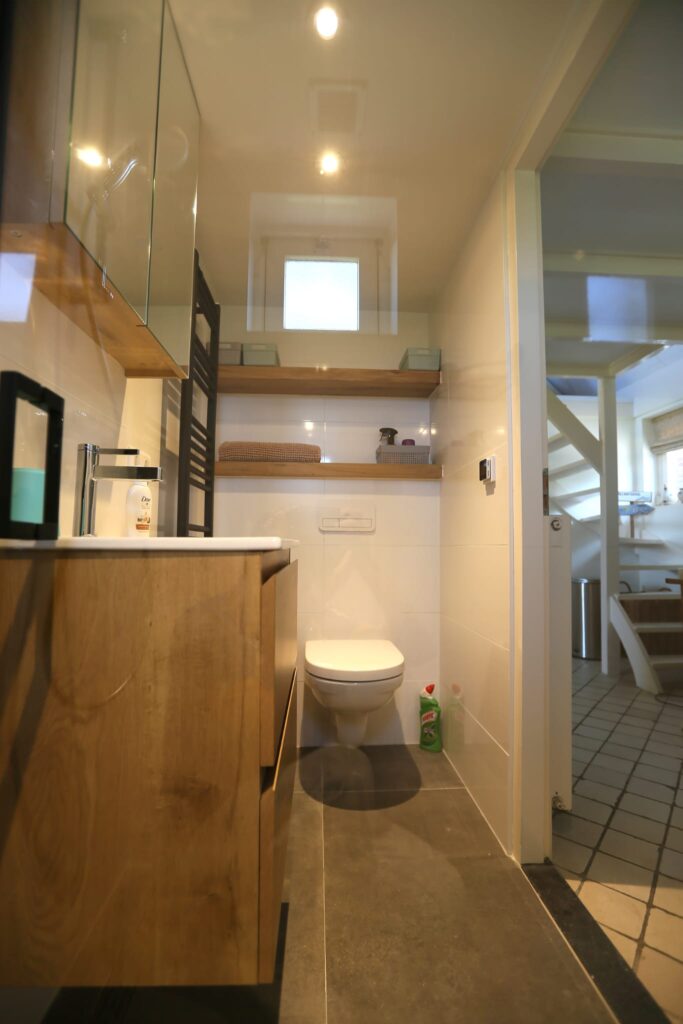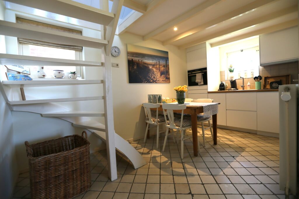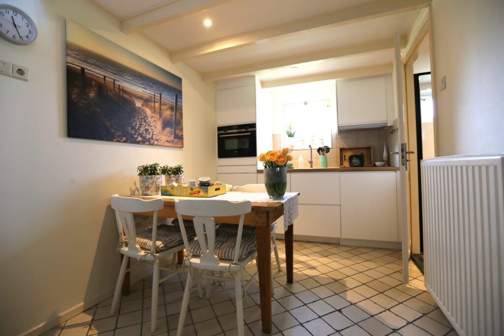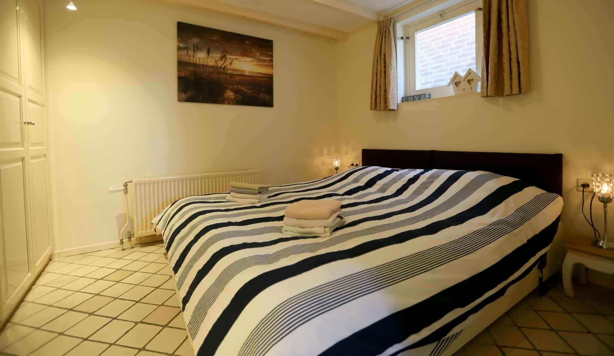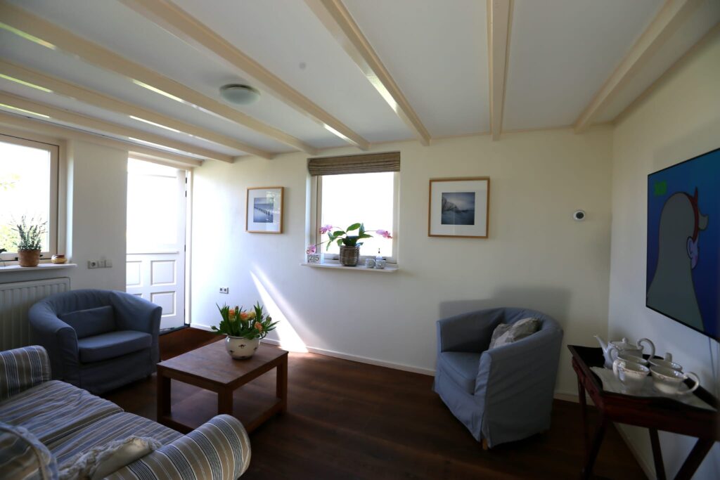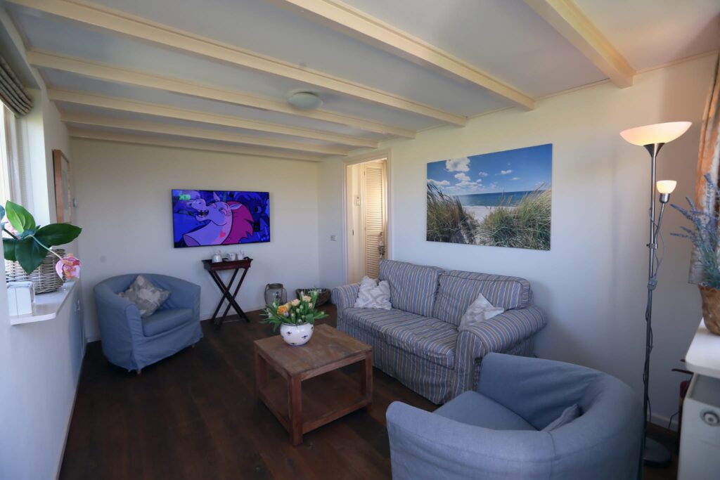 The holiday home has two bedrooms, a living room, and a modern kitchen with a fridge, coffee maker, combination microwave, dishwasher, and washing machine. The bathroom has also been recently modernized. The double bed downstairs is made up for you by default and costs €15. Bed linen can be rented for €7.50 per person. Towels are also available for rent at €7.50 per person.